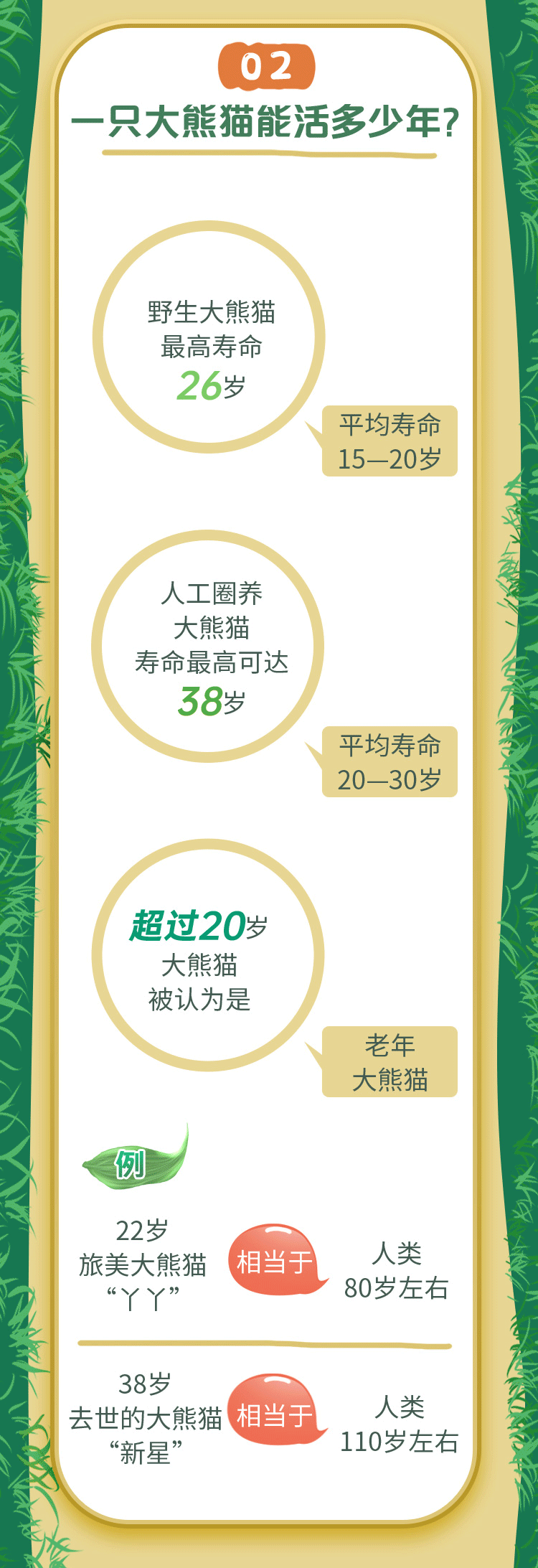 曾生活在香港海洋公园的雌性大熊猫“佳佳”和重庆动物园的雌性大熊猫“新星”都活到了38岁,相当于人类的110岁。