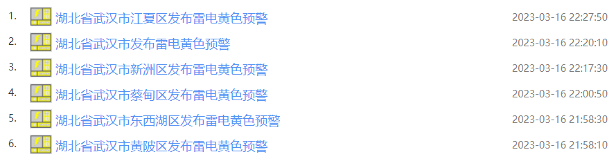 半小时内武汉发布了6条雷电黄色预警