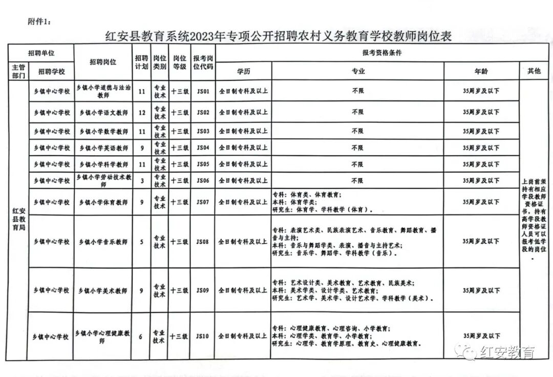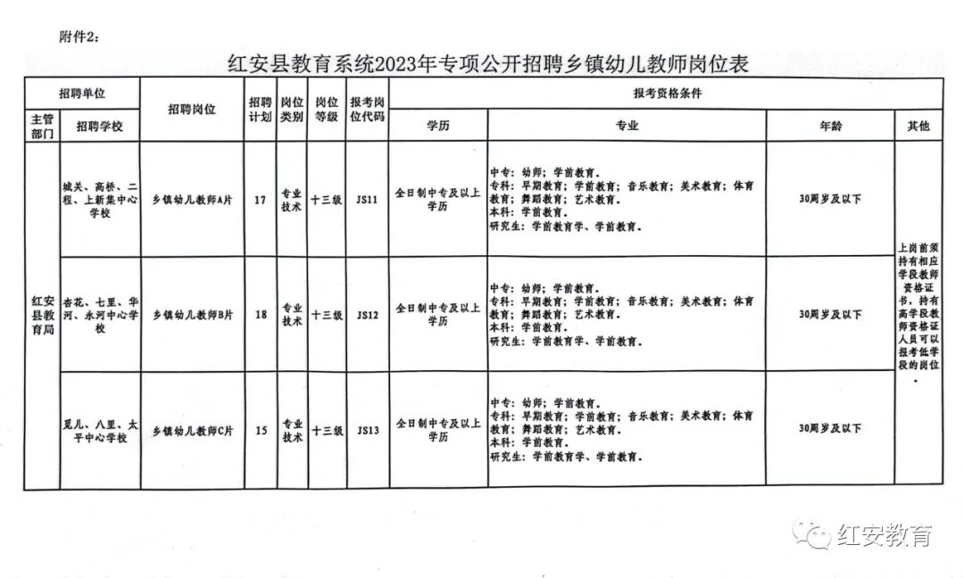 1.本次招聘的单位、岗位及资格条件详见《红安县教育系统2023年专项公开招聘教师岗位表》(见附件,简称《岗位表》)。