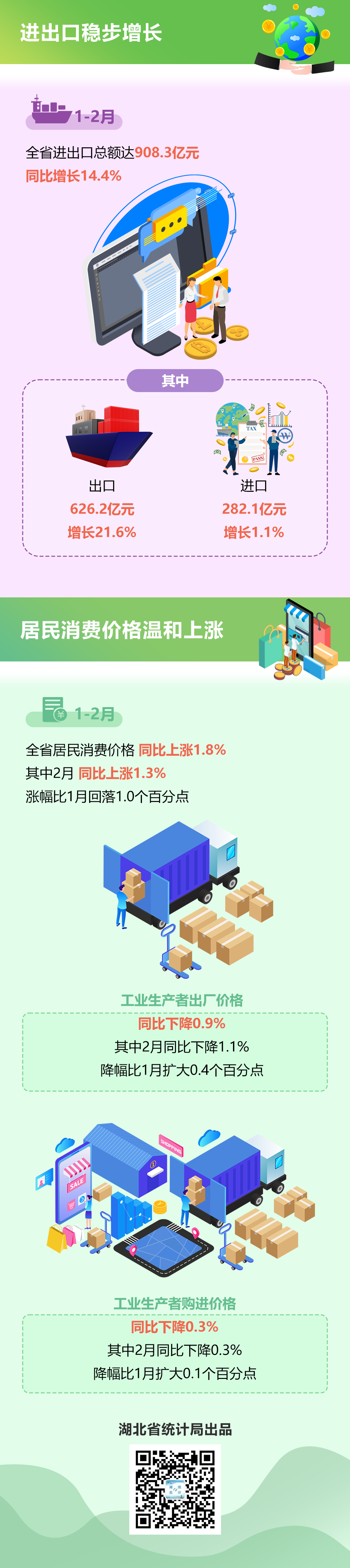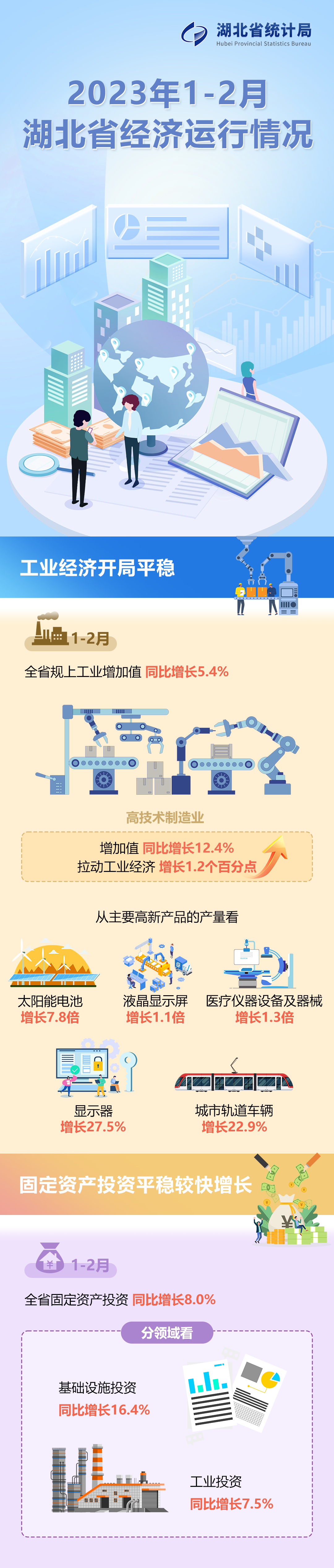 3月18日,湖北省统计局发布今年1至2月份全省经济运行数据。最新数据显示,市场预期加快好转,投资、消费、工业等经济运行呈现企稳回升态势。