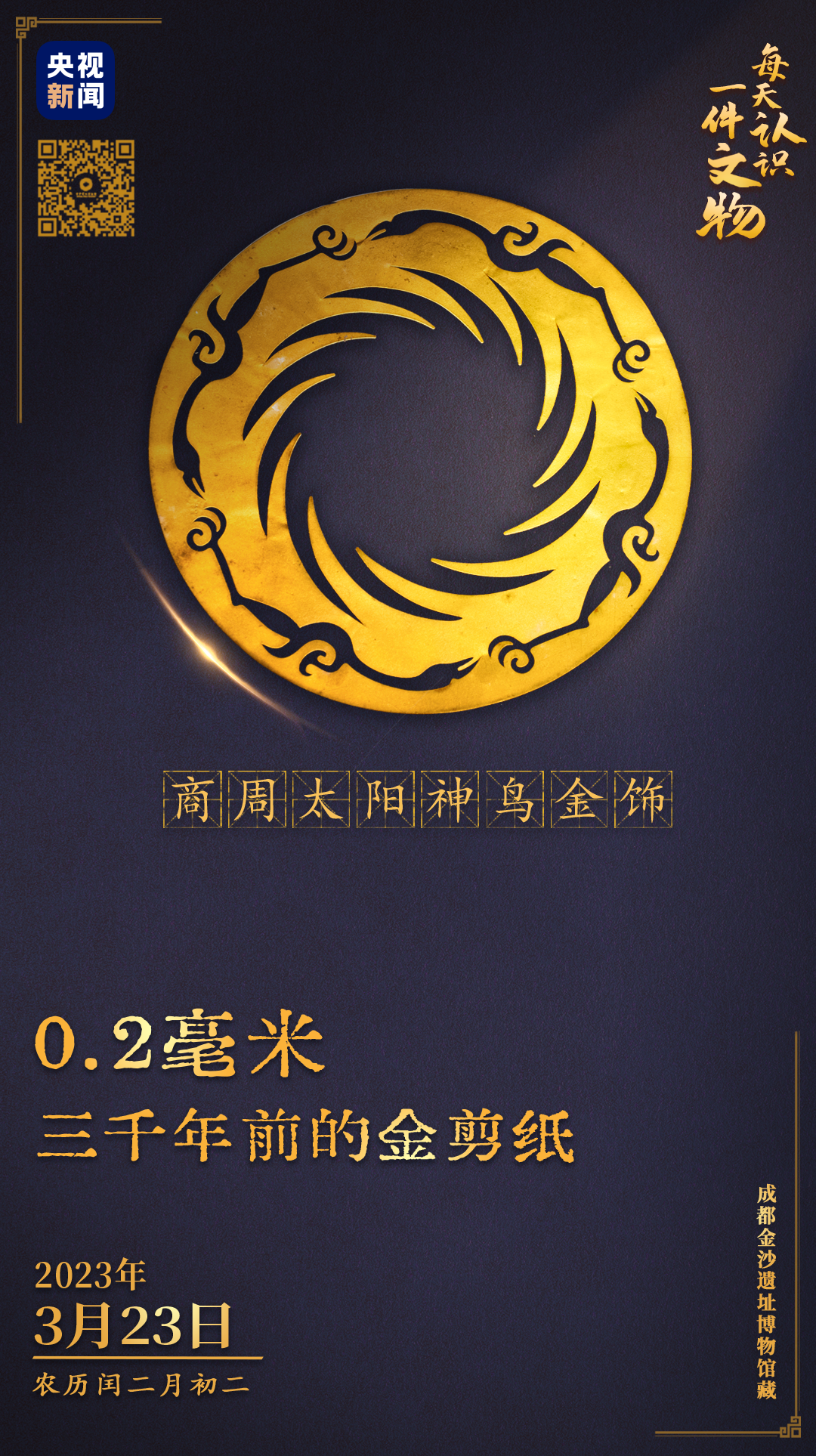 太阳神鸟金饰,薄如蝉翼,厚不过0.2毫米,含金量却高达94.2%。3000年前的古蜀人,精心制作出了这枚“掌心的太阳”。它的图案仿佛四只神鸟背负太阳顺时针滚转,寓意太阳东升西落,寄托着古人对时间的理解和想象。一起欣赏它惊艳时光的美!