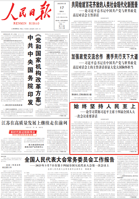 习近平主席在十四届全国人大一次会议上发表重要讲话,深刻指出“全面建成社会主义现代化强国,人民是决定性力量”,强调在强国建设、民族复兴的新征程“我们要始终坚持人民至上”。