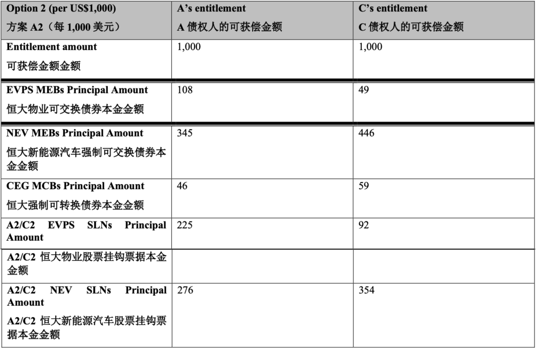 第一种方案中,协议安排债权人可以按其可获偿金额1:1的转换比率获得将由中国恒大发行的新票据,新票据期限为10–12年,将随着时间的推移偿还。