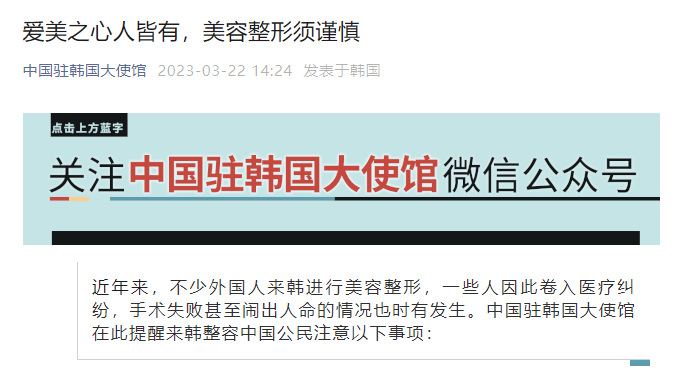 据中国驻韩国大使馆微信公众号消息,近年来,不少外国人来韩进行美容整形,一些人因此卷入医疗纠纷,手术失败甚至闹出人命的情况也时有发生。中国驻韩国大使馆在此提醒来韩整容中国公民注意以下事项: