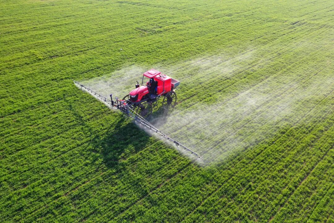 安徽省蒙城县双涧镇农民为小麦喷洒防治病虫害药物(2023年2月27日摄,无人机照片)。新华社发(胡卫国 摄)