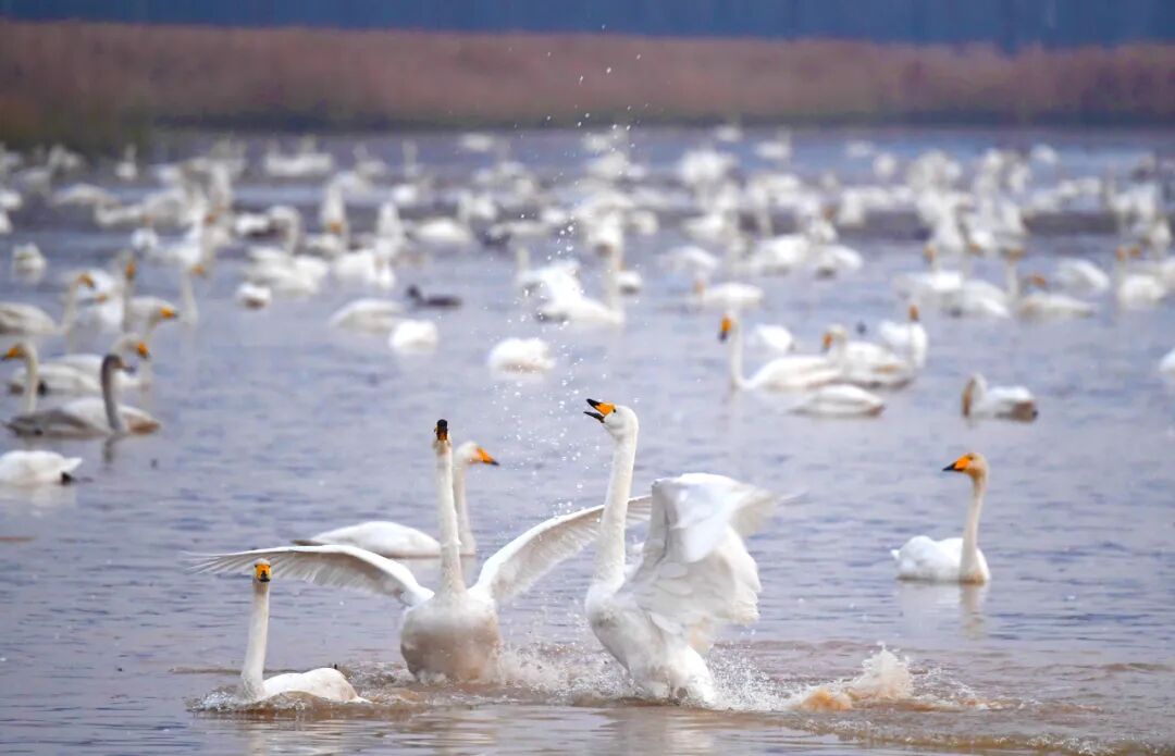 天鹅在河南省三门峡黄河湿地嬉戏(2022年11月22日摄)。新华社记者 郝源 摄