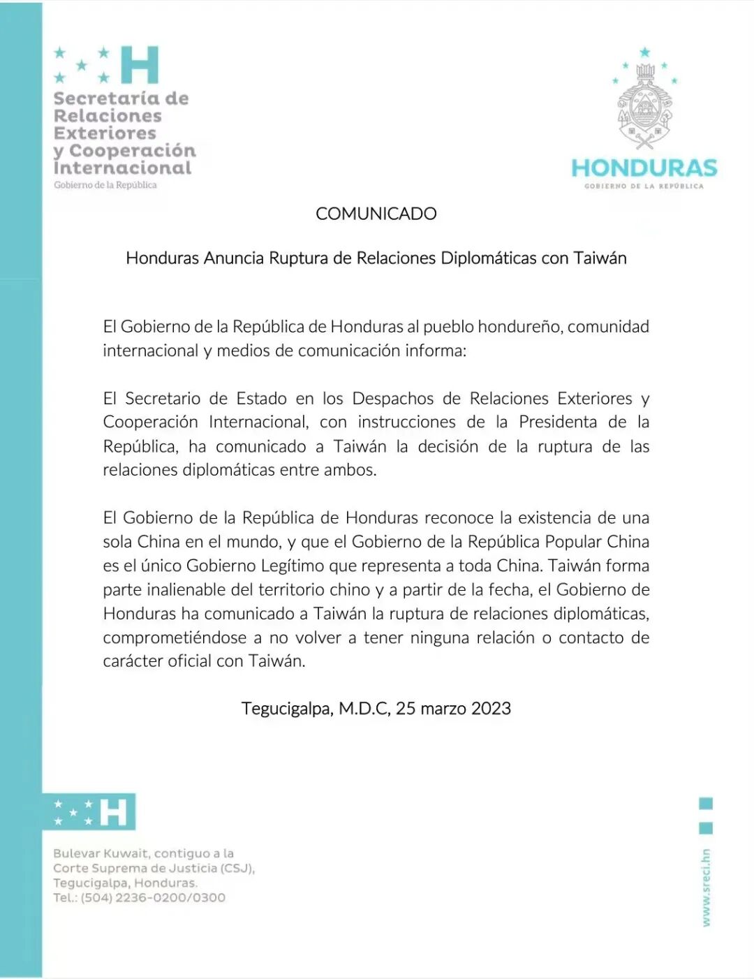 声明说,世界上只有一个中国,中华人民共和国是代表中国的唯一合法政府,台湾是中国领土不可分割的一部分。洪都拉斯自即日起断绝与台湾的“外交关系”并停止与台湾的一切接触和官方联系。