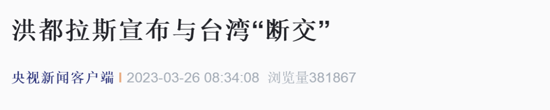 据央视新闻客户端消息,当地时间3月25日,洪都拉斯外交部发表声明,正式宣布与中国台湾断绝“外交关系”。