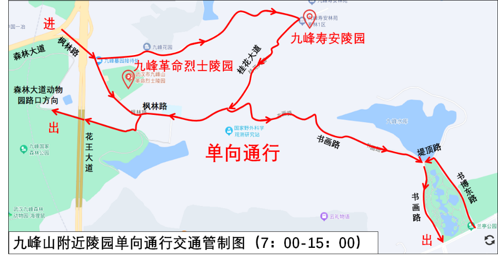 ●交通管制:九峰山附近陵园在管制期间实行单向通行,单向通行方向为:由森林大道枫林路口进、由九峰山一路书画路及森林大道动物园路口出。书博东路路口进入的车辆只能沿着书博东路—堤顶路—书画路方向出。