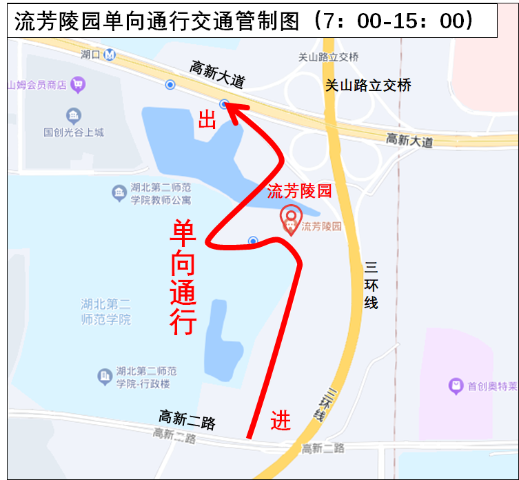 ●交通管制:流芳陵园在清明祭扫前后节假日实行单向通行,单向通行的方向由高新二路交叉口进,高新大道交叉口出。