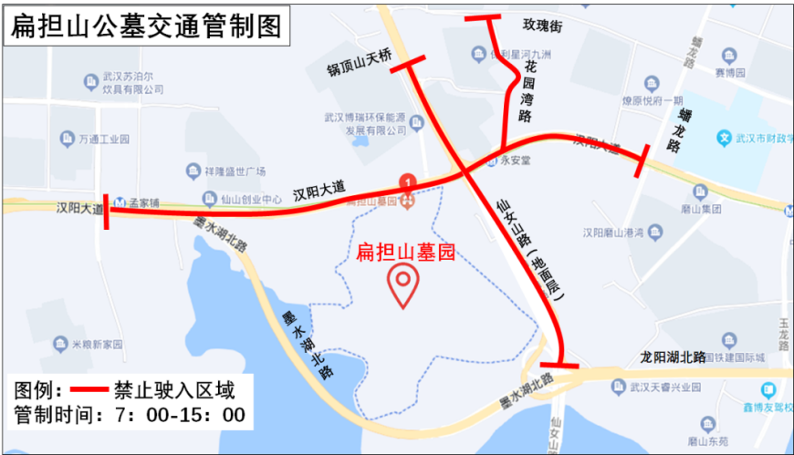 ●交通管制:扁担山公墓在清明祭扫前后节假日实行交通管制,汉阳大道(蟠龙路至孟家铺地铁站)、仙女山路地面层(锅顶山天桥至龙阳湖北路)、花园湾路(玫瑰街至汉阳大道)禁止机动车通行(公交车、出租车、持证车除外)。