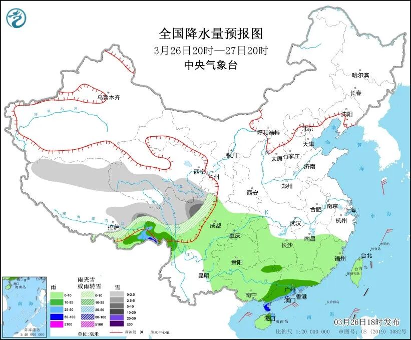 中央气象台预计,26日20时至27日20时,西藏北部和东部、青海南部、川西高原中北部等地部分地区有小雪或雨夹雪,其中,西藏东北部、川西高原北部等地部分地区有中到大雪。西藏东南部、华南南部等地部分地区有中到大雨,其中,西藏东南部、广东西南部沿海等地部分地区有暴雨。