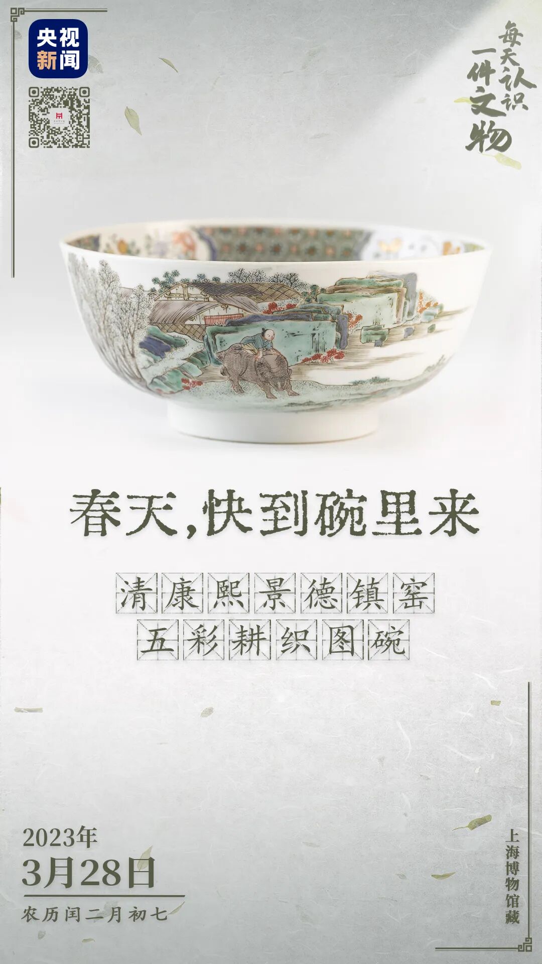 清康熙景德镇窑五彩耕织图碗虽叫做“五彩”碗,但碗体绘画图案上的颜色可不止五种。它所描绘的春耕景象,实际源出康熙《御制耕织图》。相比于传统中国画,画师创作《御制耕织图》时融合了西洋画的透视法。这件碗上共画了几头牛,描绘了怎样一番百姓春耕图景?