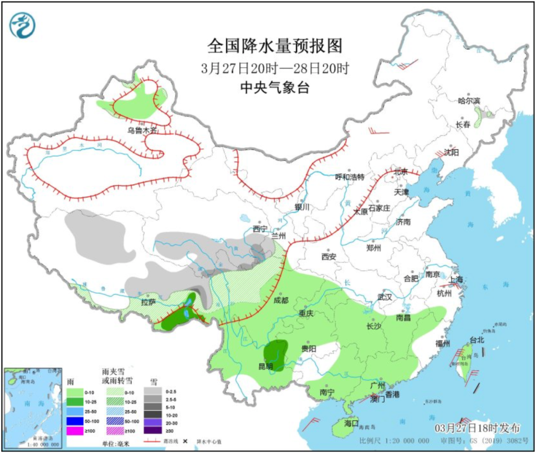 中央气象台预计,27日20时至28日20时,西藏北部和东部、青海南部、甘肃南部、川西高原北部等地部分地区有小到中雪或雨夹雪,其中,西藏东北部、青海南部、甘肃南部等地局地有大雪。西藏东南部、江南中南部和西部、西南地区大部、华南大部、台湾岛等地部分地区有小到中雨,局地有大雨。