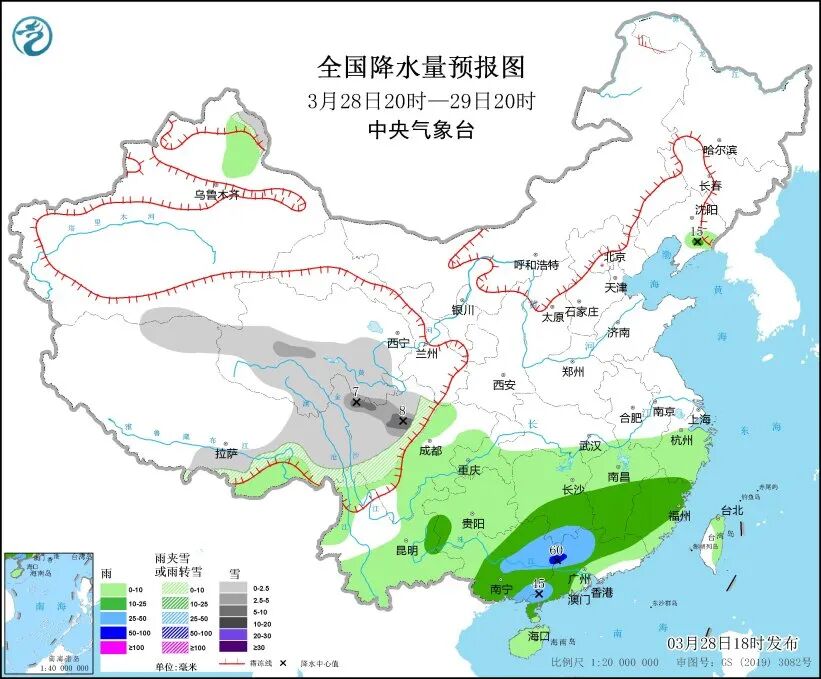 中央气象台预计,28日20时至29日20时,西藏西北部和东部、青海中南部、川西高原等地部分地区有小到中雪或雨夹雪,其中,川西高原北部等地的部分地区有大雪。贵州西南部、湖南南部、江西中南部、福建大部、广西中东部、广东西南部和北部等地部分地区有中到大雨,其中,广西东部、广东西部等地局地有暴雨。