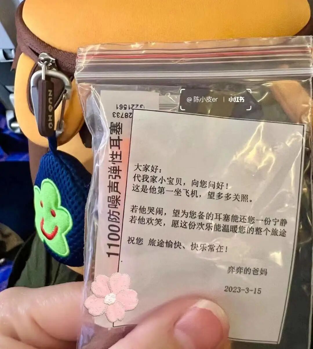 宝宝出生两年来,第一次带他坐飞机。怕他会因为陌生环境哭闹,给周围乘客准备了耳塞和纸条。