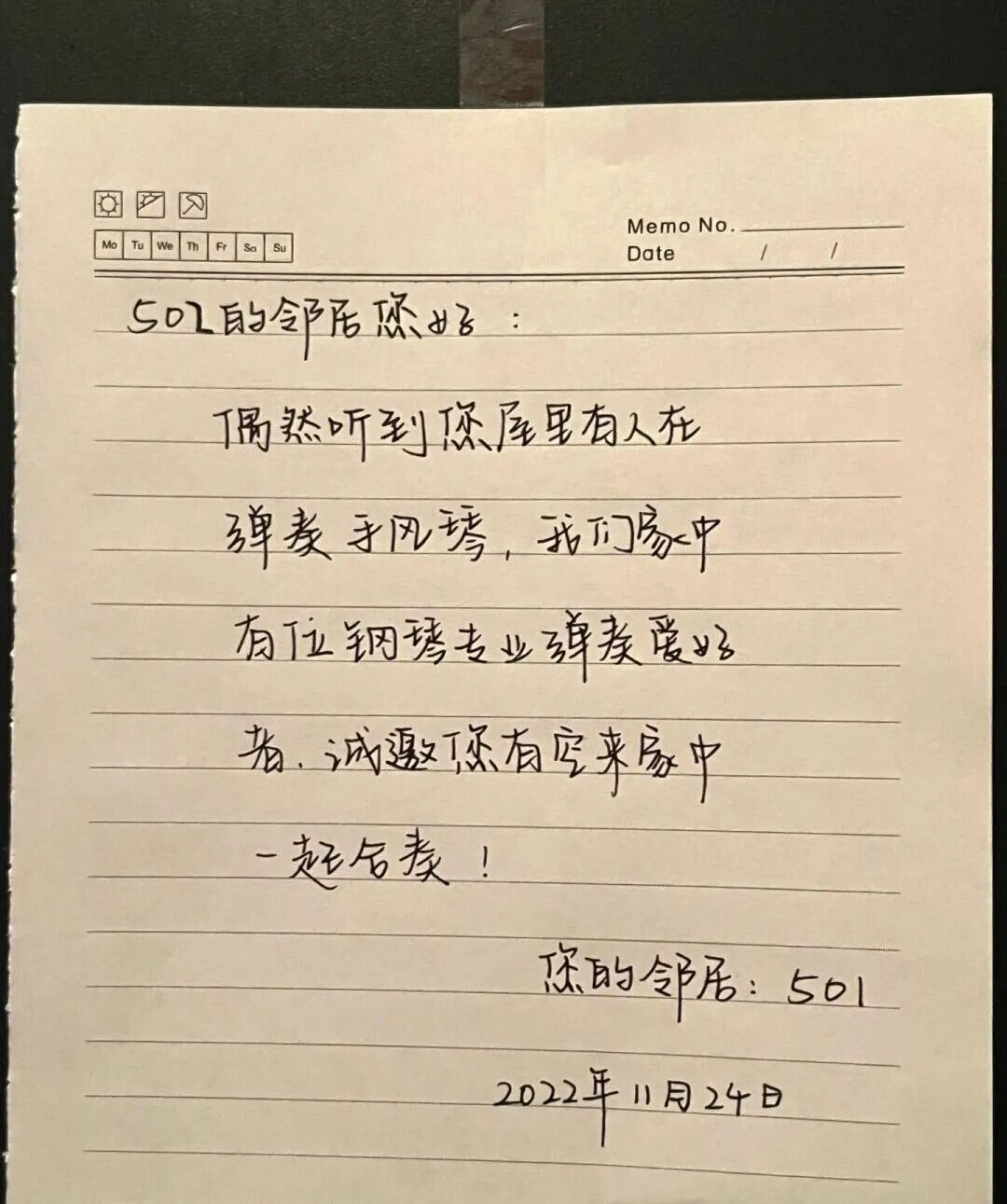 对门住了两位老爷爷,偶尔在电梯里碰到但没打过招呼,邀请他们来家里一起合奏。期待!@再也不上班