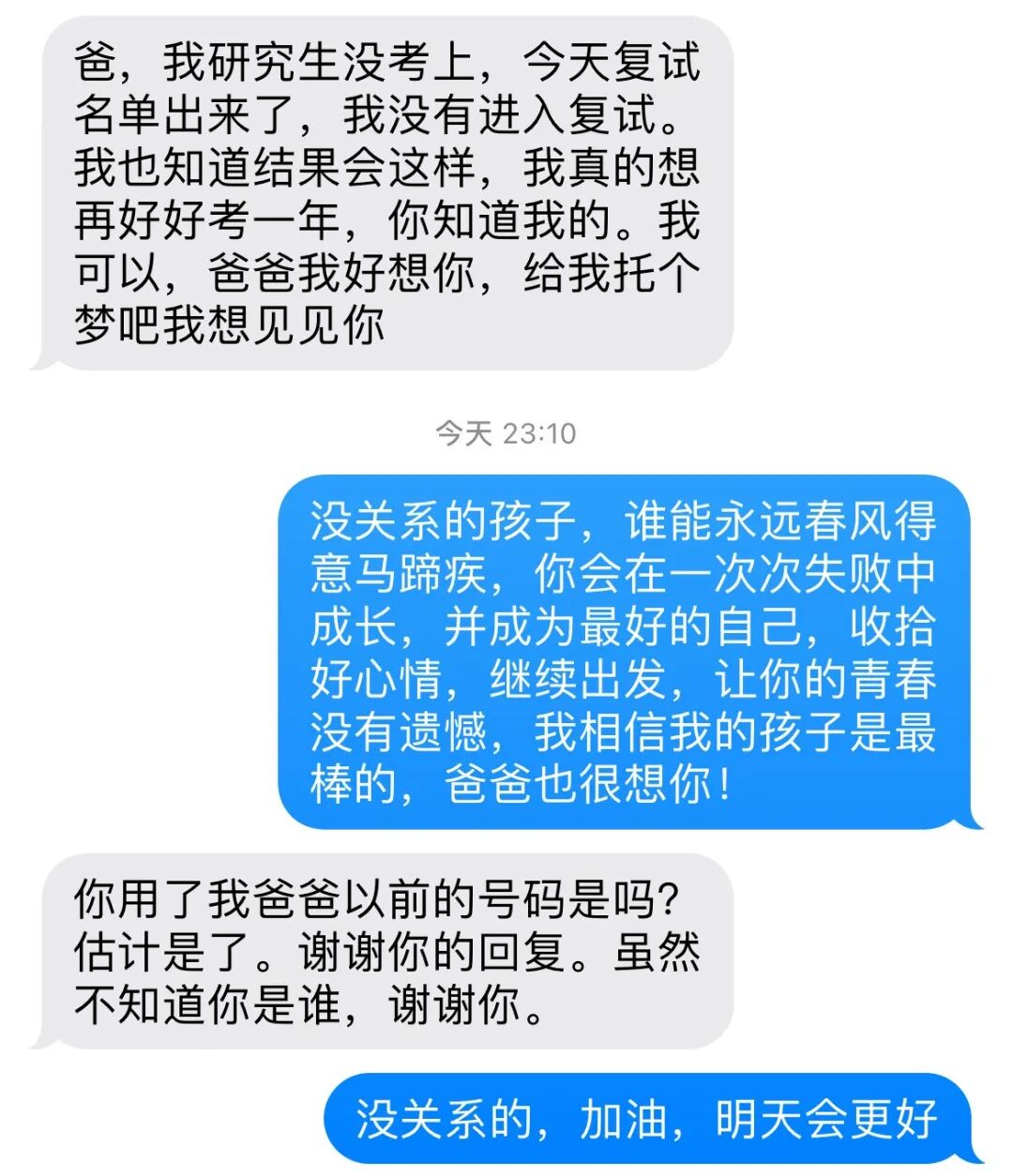 近日,陕西西安,一名考研学生给父亲生前使用的手机号码发短信,讲述自己的现状和对爸爸的思念。没想到新机主收到短信后,以其父亲的名义暖心回复,鼓励他“收拾好心情,重新出发”。
