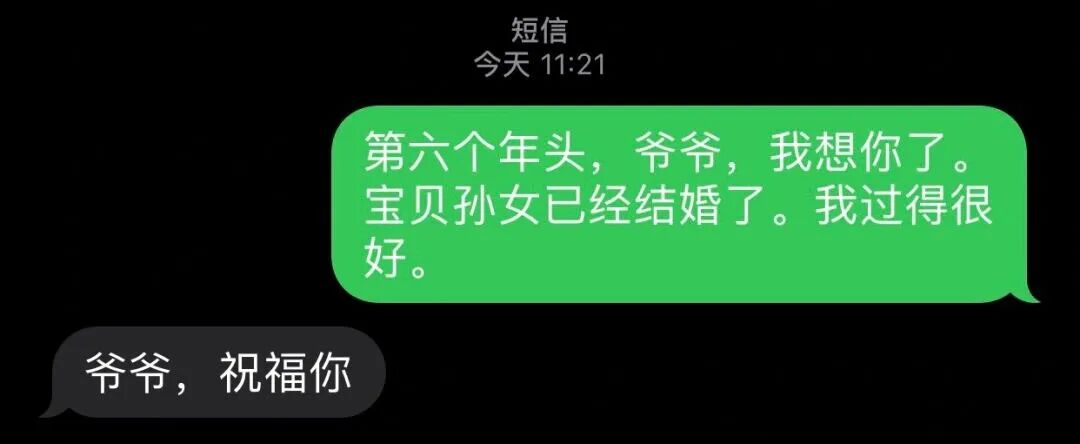 爷爷去世的第六年,还是舍不得删掉爷爷的手机号。最近梦到爷爷了,很紧张也很挣扎地发了这条信息,没想到三分钟后收到了回信。谢谢陌生人,真的很心安。@鱼子酱