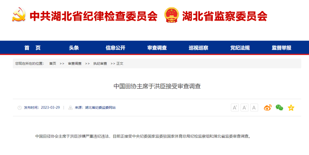 据湖北省纪委监委网站消息:中国田径协会主席于洪臣涉嫌严重违纪违法,目前正接受中央纪委国家监委驻国家体育总局纪检监察组和湖北省监委审查调查。