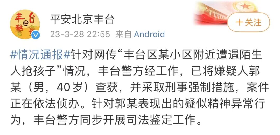 据@平安北京丰台 通报:针对网传“丰台区某小区附近遭遇陌生人抢孩子”情况,丰台警方经工作,已将嫌疑人郭某(男,40岁)查获,并采取刑事强制措施,案件正在依法侦办。针对郭某表现出的疑似精神异常行为,丰台警方同步开展司法鉴定工作。