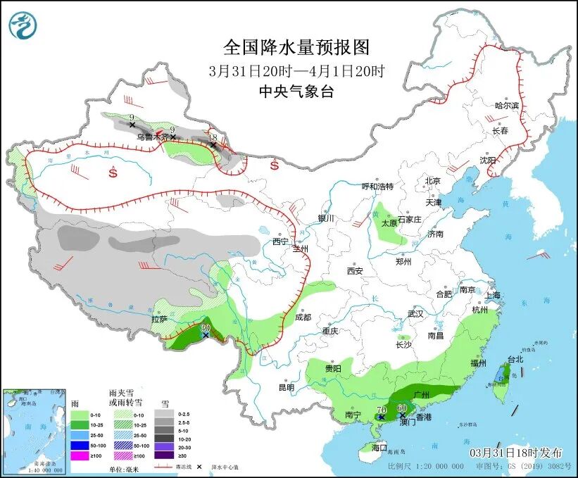 中央气象台预计,3月31日20时至4月1日20时,新疆沿天山地区和东部、西藏大部、青海南部和西部等地部分地区有小雪或雨夹雪,部分地区有中到大雪,局地暴雪。西藏东南部、广东大部、台湾岛等地部分地区有中到大雨,其中,广东西南部等地部分地区有暴雨。