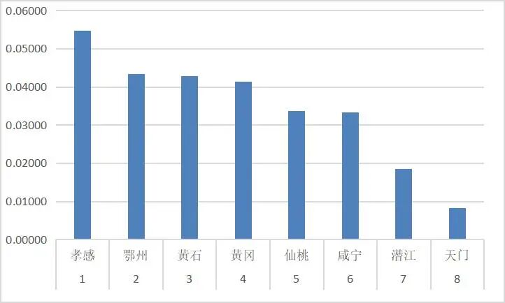 城市融合指数依据交通互联互通指数、产业协同发展指数、开放合作指数、公共服务共建共享指数、生态环境共保联治指数、市场一体化指数、体制机制保障指数等7项指标进行综合统计作出。八市总体城市融合指数均值为0.035,在8个城市样本中有4个城市的城市融合指数值高于均值,4个低于均值,与武汉地域空间上直接交界的城市融合指数显著较强。此外,排名还呈现“孝鄂黄稳占三甲”、“黄仙咸潜天位次不变”,孝感首次夺得首位。