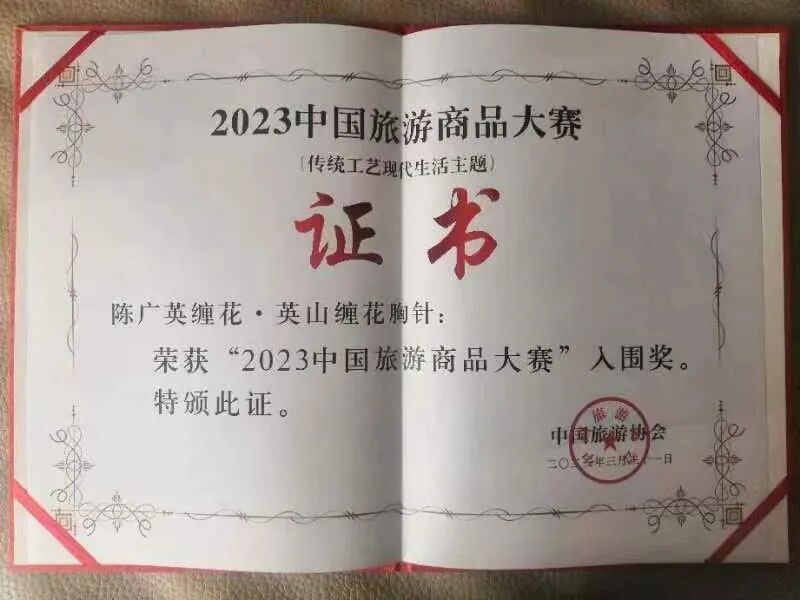 第17届中国义乌文化和旅游产品交易博览会开幕期间,由文化和旅游部、浙江省人民政府主办的2023中国旅游商品大赛同期举办,黄冈市英山缠花胸针喜获中国旅游商品大赛入围奖。