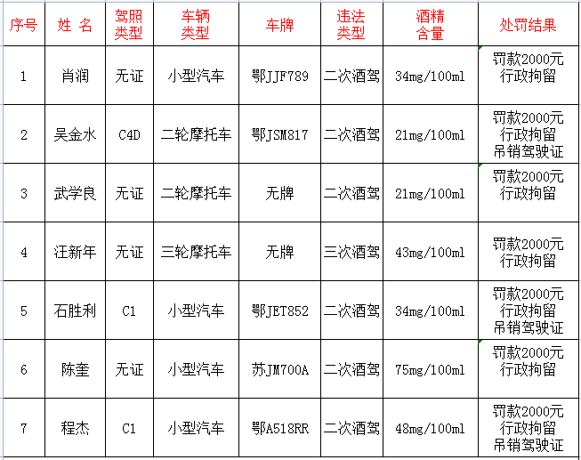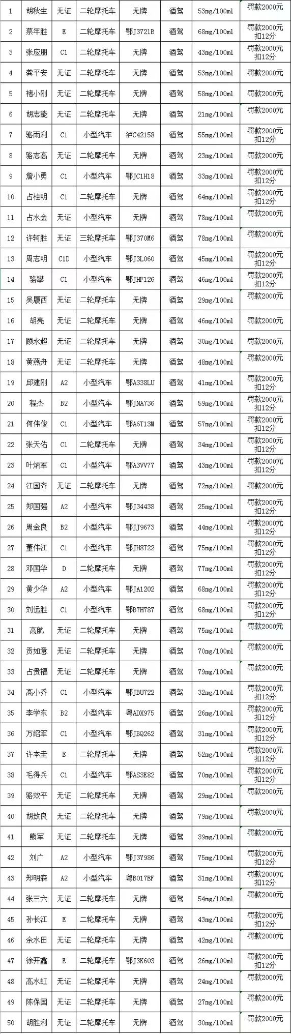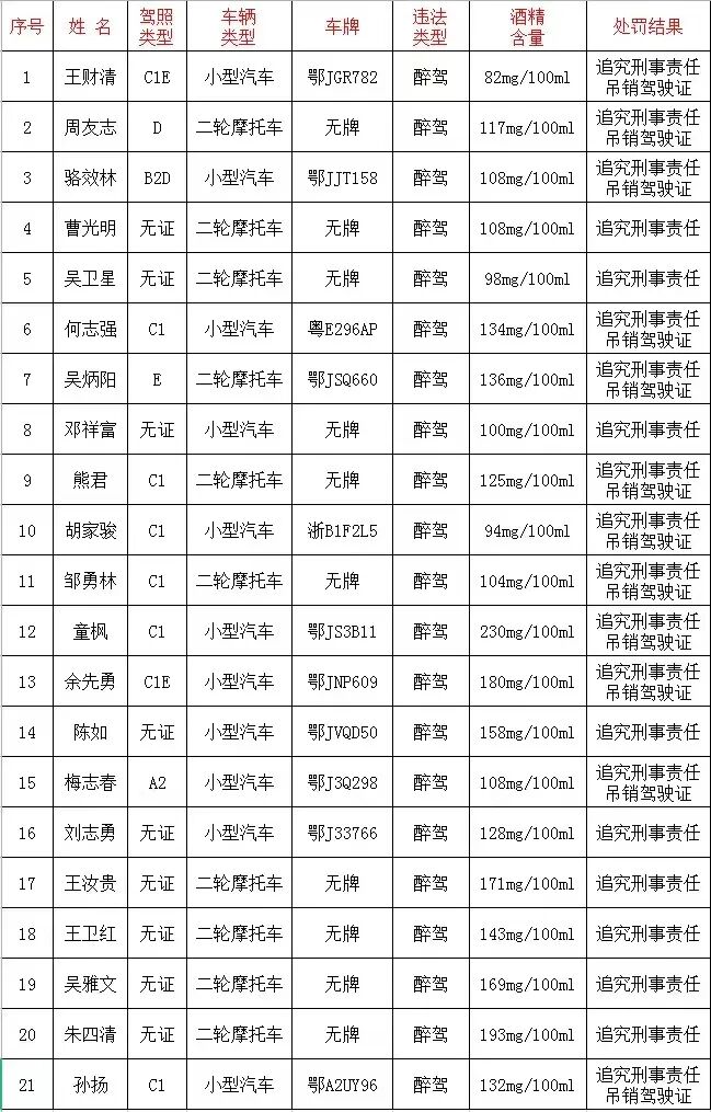 酒驾醉驾违法一直以来都是屡禁不止,甚至在高发期出现越查越多的现象,马上要进入夏季了,也是酒驾高发季,为提前警示大家,现将2月24日至3月31日期间,蕲春酒醉驾违法人员名单曝光如下: