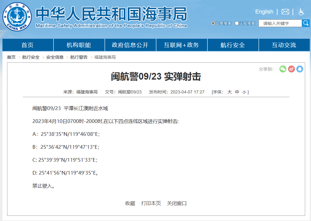 2023年4月10日0700时-2000时,在以下四点连线区域进行实弹射击:
