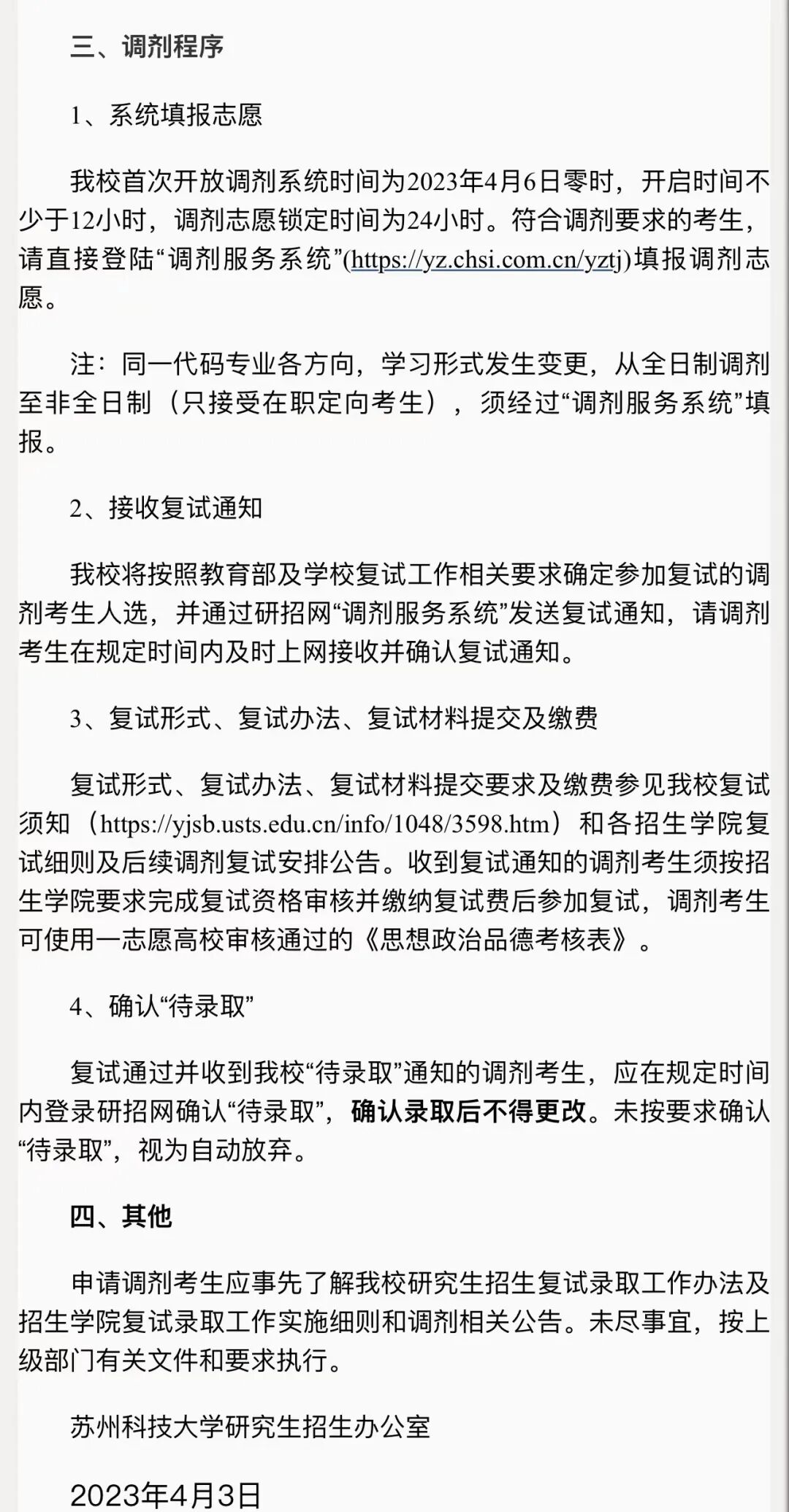 符合调剂要求的考生,请直接登陆“调剂服务系统”填报调剂志愿。该校将按照教育部及学校复试工作相关要求确定参加复试的调剂考生人选,并通过研招网“调剂服务系统”发送复试通知,请调剂考生在规定时间内及时上网接收并确认复试通知。复试通过并收到该校“待录取”通知的调剂考生,应在规定时间内登录研招网确认“待录取”,确认录取后不得更改。未按要求确认“待录取”,视为自动放弃。