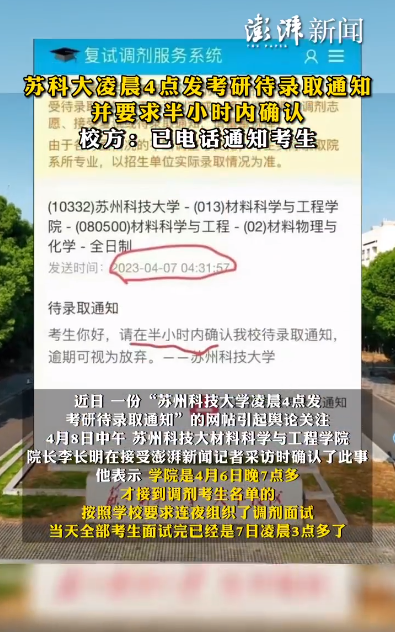 近日,一份“苏州科技大学凌晨4点发考研待录取通知”的网帖引起舆论关注。