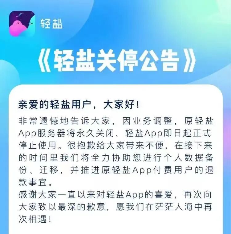 该团队承诺,将全力协助用户进行个人数据备份、迁移并推进原轻盐App付费用户的退款事宜