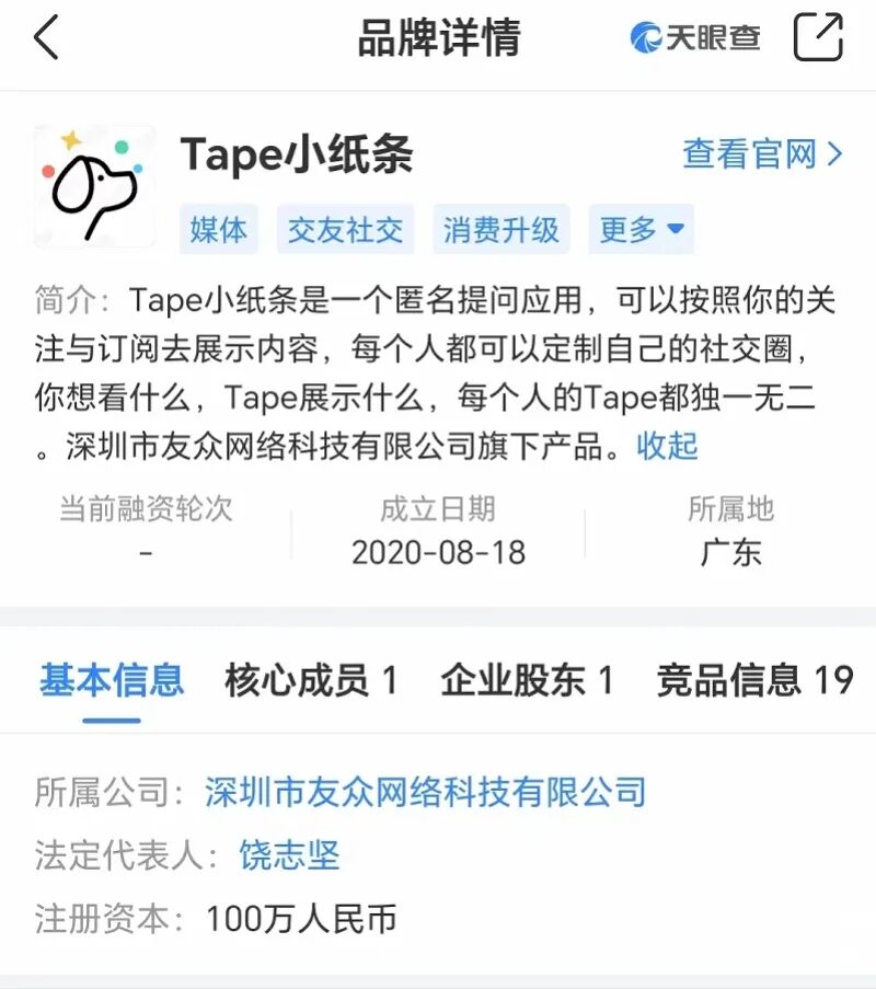 据公开信息显示,Popi提问箱和Tape小纸条的创始人为饶志坚,其运营主体公司为深圳市友众网络科技有限公司。2022年,Tape小纸条更名为轻盐,其运营主体也变为山东庚辰义成网络技术有限公司。