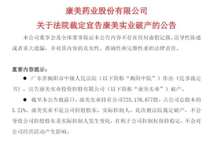 近日,ST康美(原康美药业)发布公告称,广东省揭阳市中级人民法院作出《民事裁定书》,宣告康美实业投资控股有限公司(以下简称“康美实业”)破产。