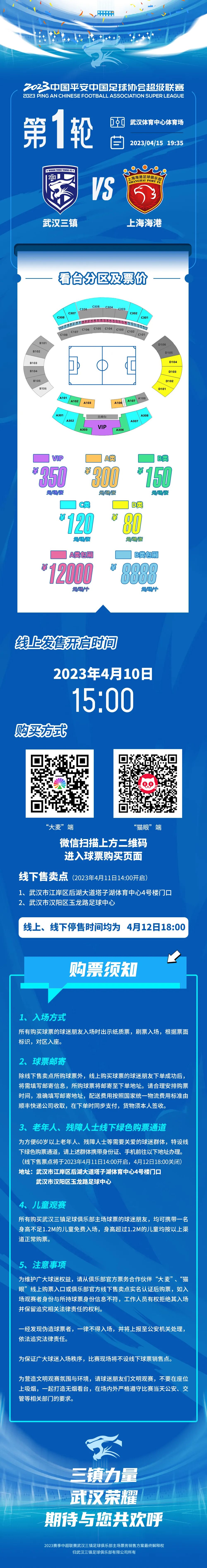2022赛季中超联赛冠军武汉三镇队将在2023赛季中超联赛首轮中主场对阵上海海港,本场比赛球票线上发售于4月10日15:00开启,线下售卖点于4月11日14:00开启,线上、线下停售时间均为4月12日18:00。票务详情及购买方式请查看下图。