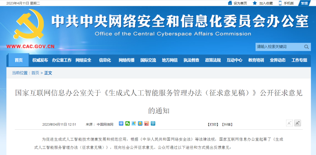国家互联网信息办公室关于《生成式人工智能服务管理办法(征求意见稿)》公开征求意见的通知