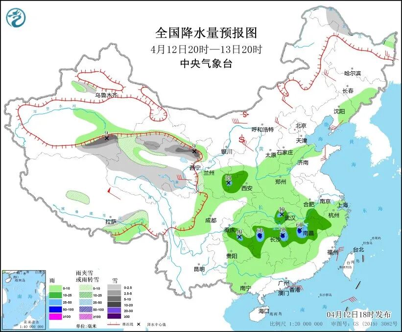 中央气象台预计,12日20时至13日20时,黑龙江西北部、新疆南疆盆地南部、西藏东南部、青海大部、甘肃河西等地部分地区有小到中雪或雨夹雪,其中,新疆南疆盆地南部、青海东北部、甘肃河西等地部分地区有大雪。陕西中部、西南地区东南部、江南北部等地部分地区有中到大雨,其中,湖南中西部、江西北部等地局地有暴雨。