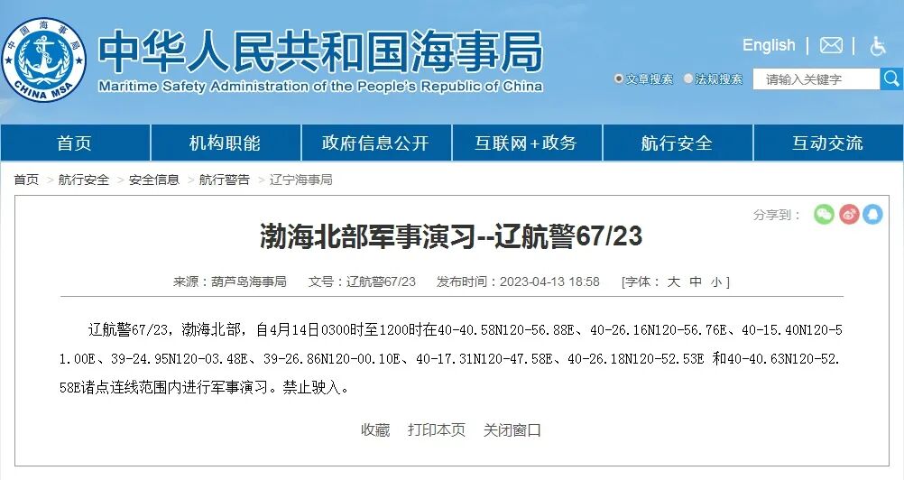 据中国海事局网站消息,葫芦岛海事局发布航行警告,4月14日3时至12时,渤海北部部分范围内进行军事演习,禁止驶入。