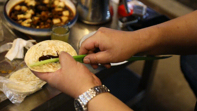 展开小饼沾满酱料的一面向上拿起一串烤肉用小饼半包裹微微用力使肉与铁签分离最后再放上一节小葱卷起来送入口中