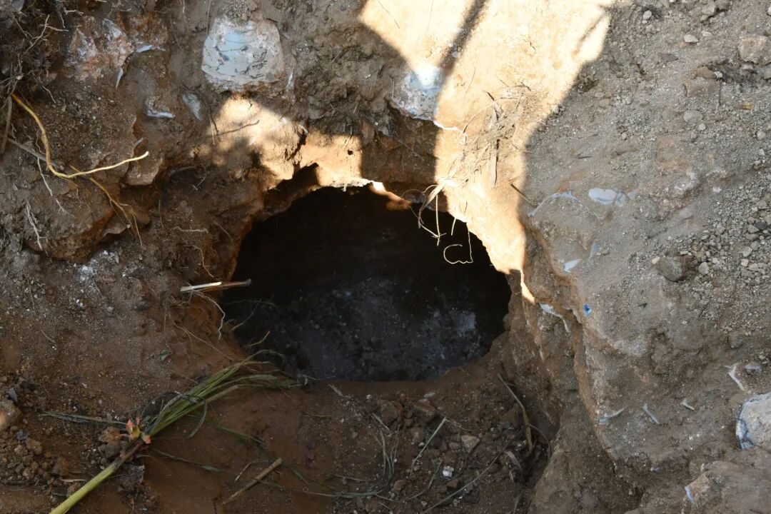 胡某三人,赶到现场后,发现“王坟”的旁边,出现了一个约一米宽仅能一人通过的盗洞。守墓人胡某心里“咯噔”一下,大事不好,真的被盗了。随即发现周围的杂草上有散落的新土,旁边有人的骨头残渣和陶瓷碎片,胡某赶紧向文物局和公安局报了案。