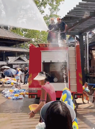 泼水节怎么能少得了“专业选手”,消防员带着专业设备上场,参与互动,时而也会遭遇泼水“围攻”。当“专业选手”遇到“民间高手”,少不了一番“缠斗”↓
