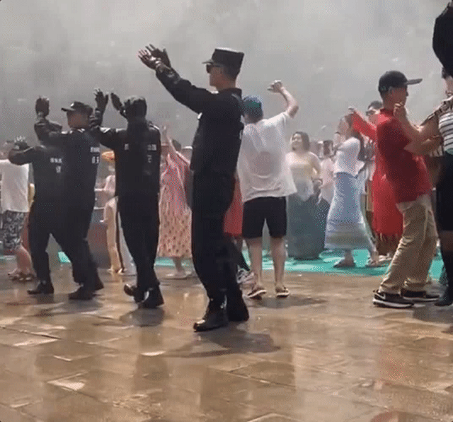 在泼水节现场,伴着欢快的音乐,人们随时可能蹦起迪,身体随着音乐律动,水线也跟着“扭动”↓
