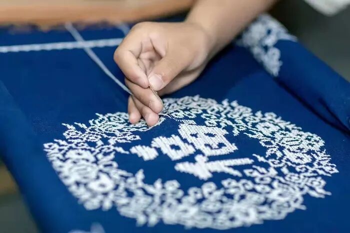 挑花并不挑工具,只需一根针、一绺线、一绷框。开绣前,手艺人将布帛紧绷于框,捏住针尖,一接一送,穿引而过。再轻轻拨捻,布面发出“嘭嘭”脆响。此时,开绣最为相宜。
