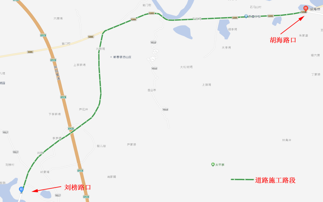 三、绕行线路:施工期间该路段只保留双向两车道通行,为保障道路安全畅通,建议除本工程施工车辆和附近居民车辆外,其他车辆从刘河—株林—横车马畈线路绕行,其中小型车辆还可从刘河复线张铺村路口—汤冲水库—曾冲水库—黄厂水库—漕河线路绕行。