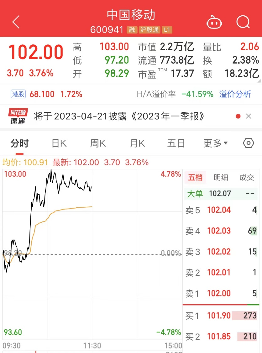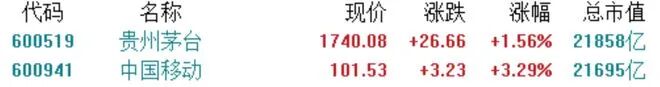 其中,中国移动上涨3.76%,盘中股价创历史新高,盘中总市值也一度超越贵州茅台,成A股市场市值最大公司。