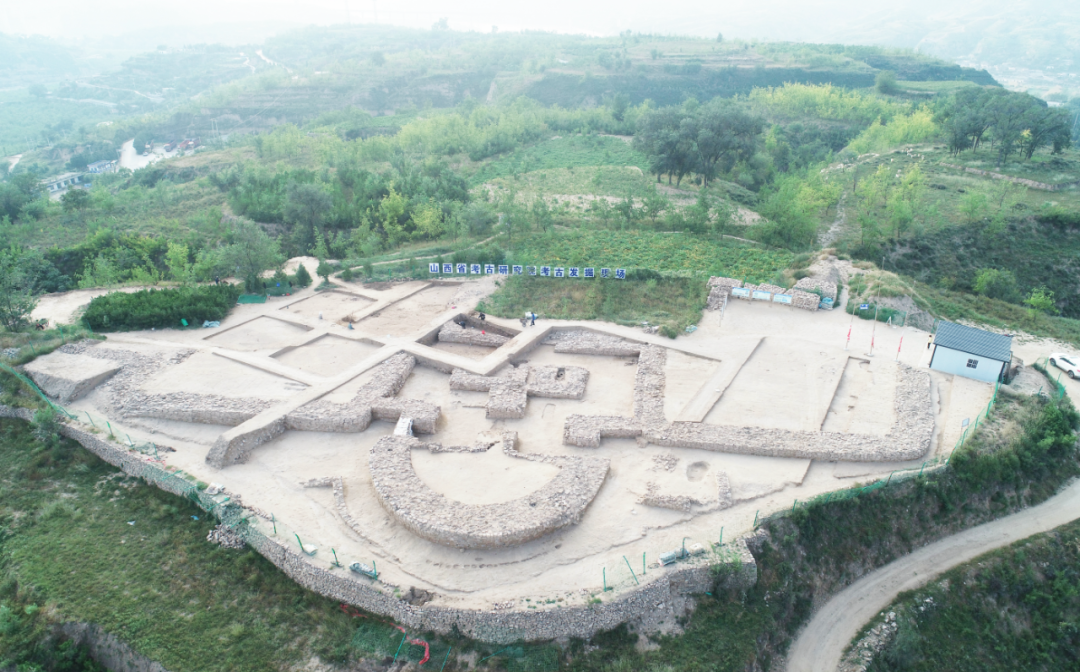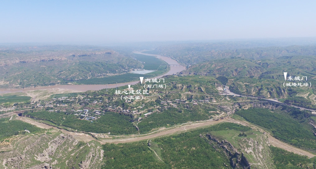 这是碧村遗址全景图。这座石城遗址位于黄河与其一级支流蔚汾河交汇处,城内残存面积75万平方米,主体年代相当于龙山时代晚期及二里头时代早期。小玉梁地点是高等级核心建筑所在地。这是一个四周砌筑护墙的高台,鼎盛时期台上建造着以大型连间房址为核心的石砌建筑群。东、南护墙保存较好,墙体厚约3.2米,由两堵厚度均为1.6米的石墙拼合而成。高台一角还有附属设施,通过台阶可上到护墙上瞭望远方。在石城中部、东部分别修筑内、外双重城墙及城门,控制通道。石门墕地点为内城墙及城门,城墙圪垛地点是外城墙及城门所在地。