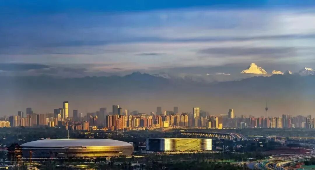 从成都东部的龙泉山向西眺望一只巨大的银色“飞碟”停靠在东安湖宽阔的湖畔与远处的城市和雪山相映成辉这便是成都大运会开幕式主场馆东安湖体育公园主体育场