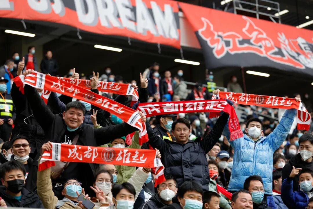 中超联赛成都蓉城对阵武汉长江的比赛中,热情的成都球迷。