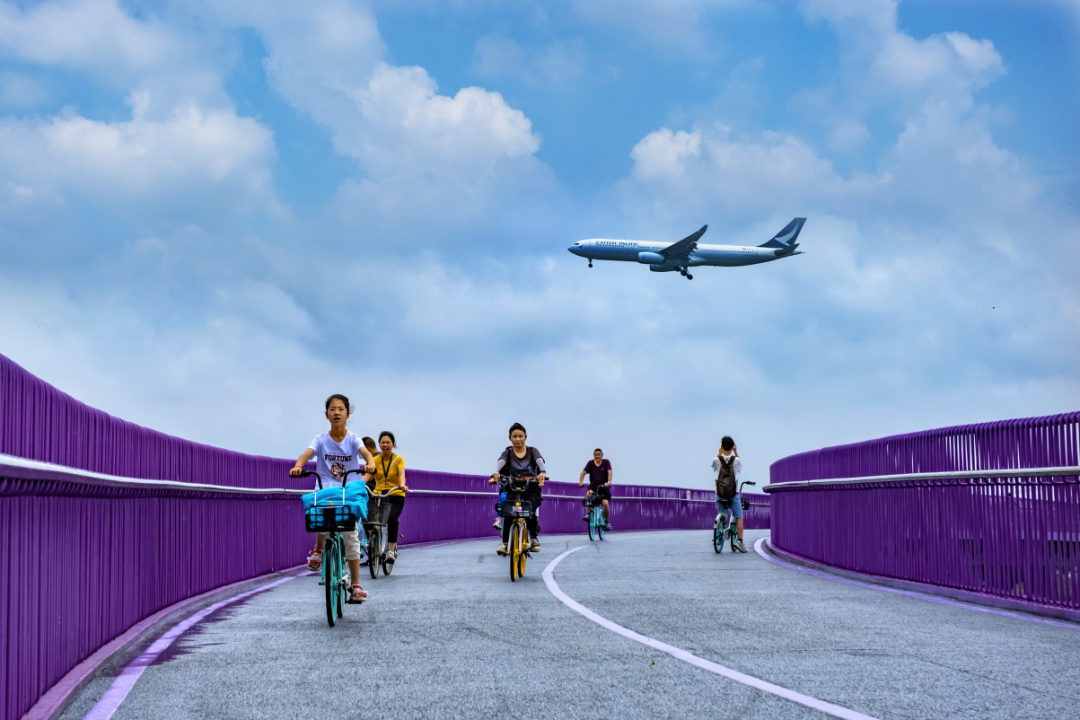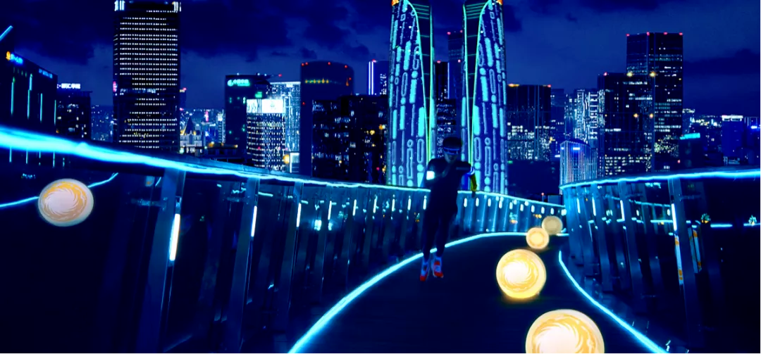 天府双塔下,头戴AR眼镜的跑者在“赛博朋克”式城市绿道上奔跑。